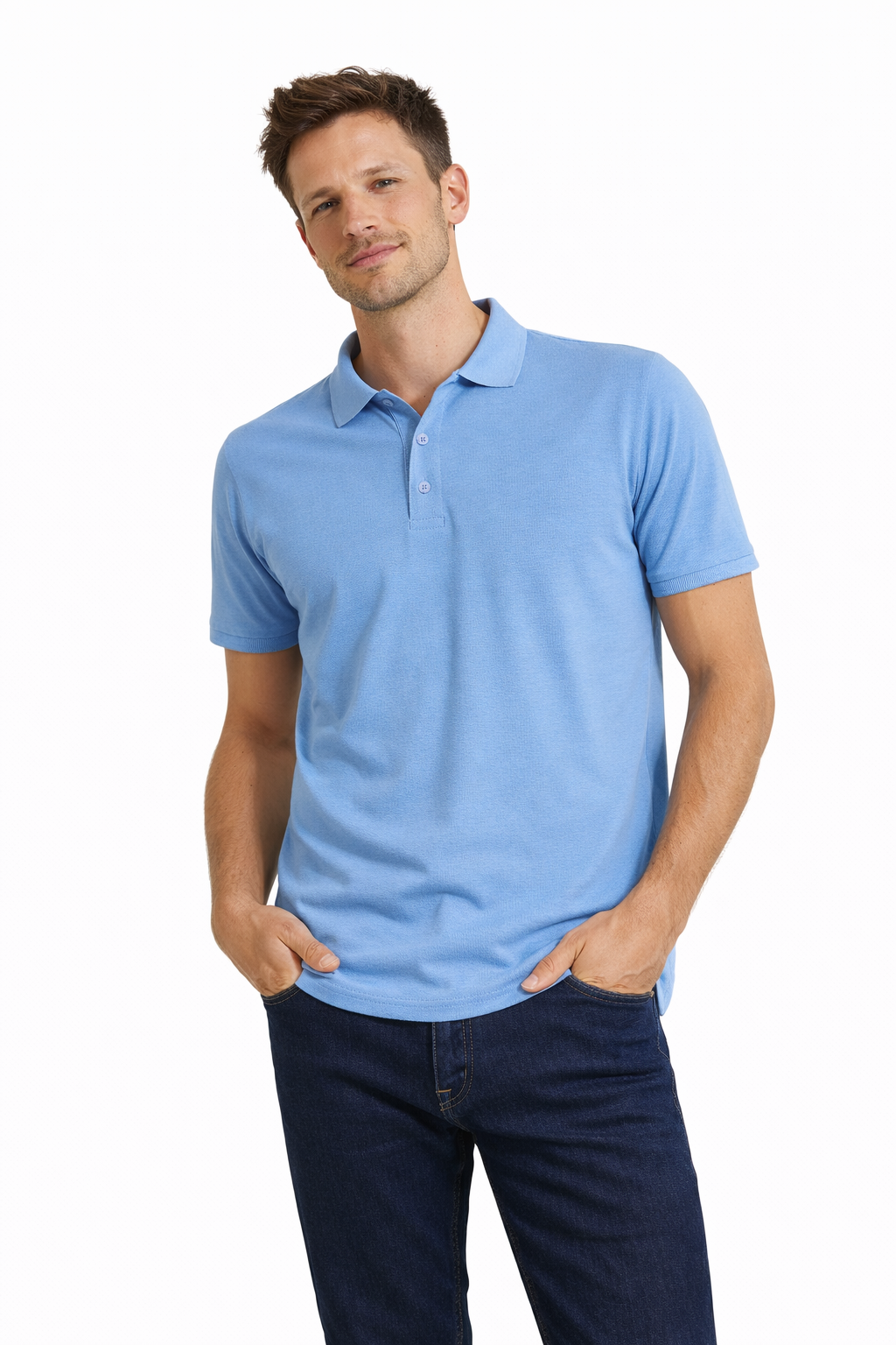 Ανδρικό κοντομάνικο μπλουζάκι τύπου POLO με λεπτή πατιλέτα με τρία κουμπιά, λάστιχο στον γιακά και στα μανίκια, κόψιμο στο πλάι και ασύμμετρο στο πίσω μέρος, αφαιρούμενη ετικέτα εσωτερικά στο πλάι, φυτίλι άλλου χρώματος περιμετρικά στον γιακά . Ειδικής ύφανσης για μέγιστη αντοχή στην συρρίκνωση κατά την πλύση, αντοχή στο στρίψιμο των ραφών και αντοχή στο χρώμα. Σύνθεση: 50% cotton + 50% polyester , 180gr/m2