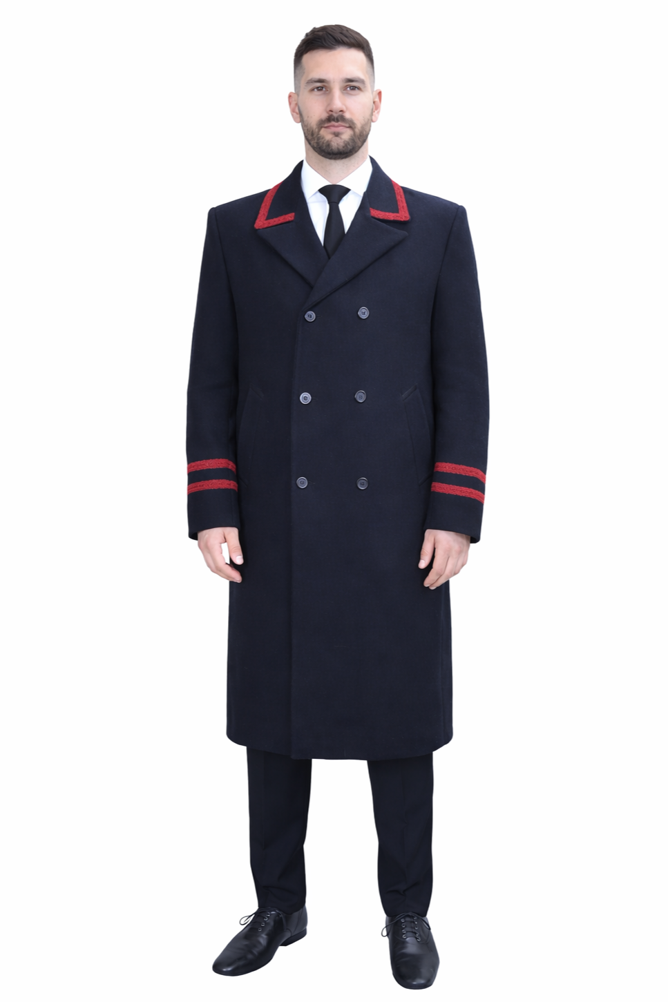 Παλτό πορτιέρη, με σταυρωτό κούμπωμα, από ύφασμα χοντρή τσόχα 70% μαλλί/30% πολυέστερ, με χρυσές λεπτομέρειες στον γιακά και τα μανίκια.