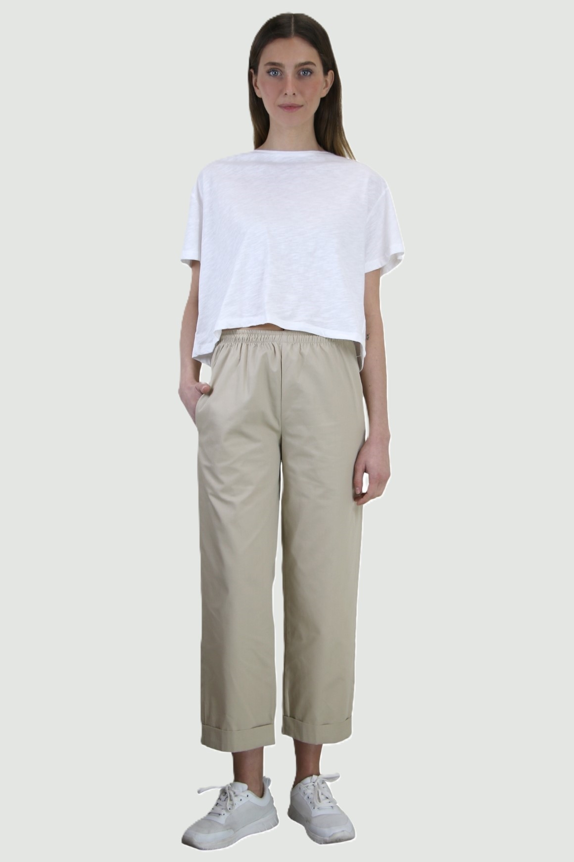 Παντελόνι γυναικείο με ρεβέρ από ύφασμα ελαφριά καπαρντίνα 170 γρ βάρος με λάστιχο και κορδόνι και δύο τσέπες μπροστά εσωτερικές.