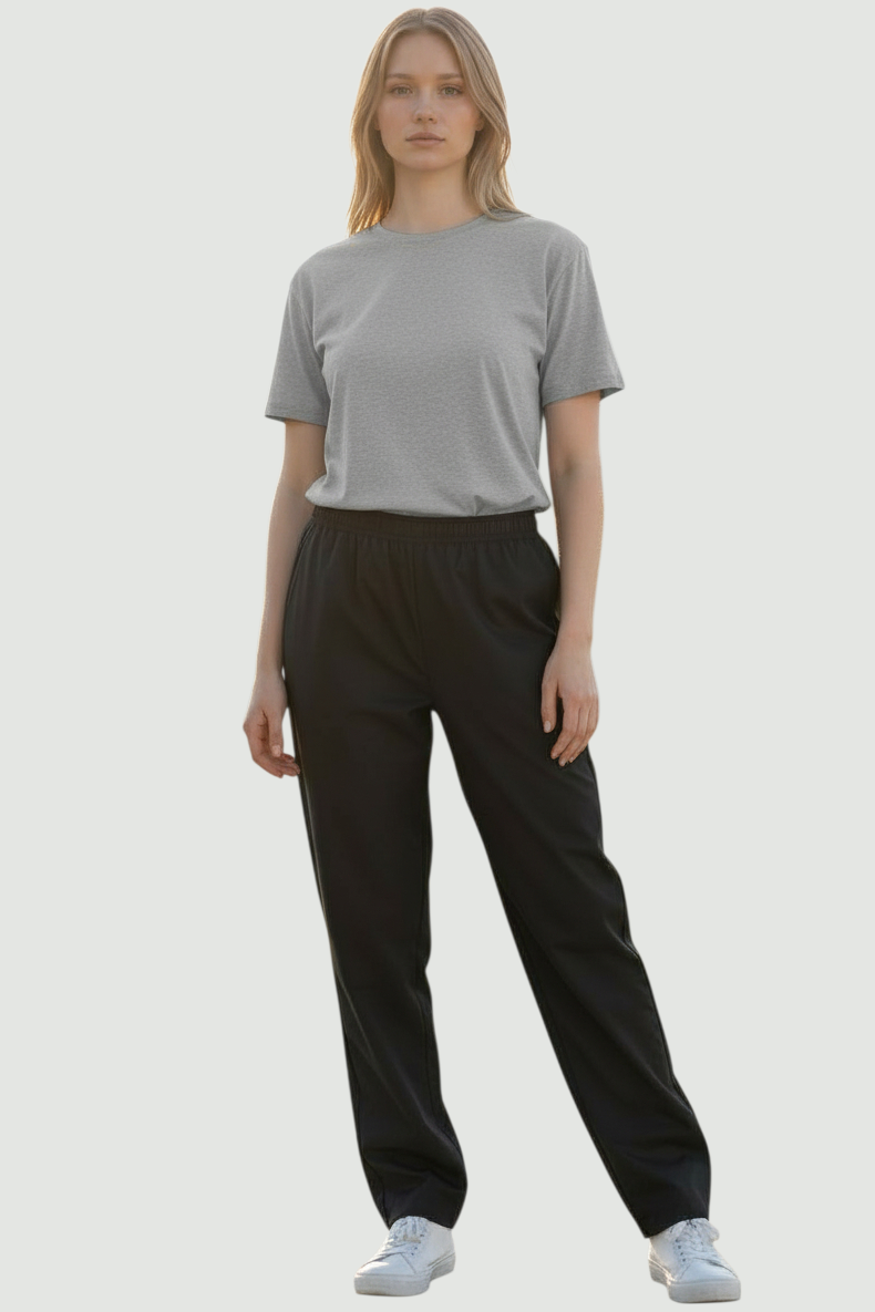 Παντελόνι με λάστιχο και εσωτερικό κορδόνι για αυξομείωση, από ύφασμα ελαφριά καπαρντίνα 65% πολ-35% βαμβ 170 γρ με δύο τσέπες μπροστά και μία πίσω, ίσια γραμμή.