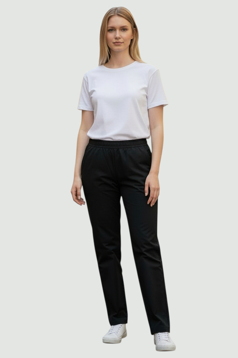 Παντελόνι με λάστιχο και εσωτερικό κορδόνι για αυξομείωση, ελαφριά καπαρντίνα 65%πολ.-35%βαμβ. 165γρ. δύο εσωτερικές τσέπες, μοντέρνα γραμμή καθώς το μπατζάκι στο τελείωμα είναι πιο στενό.