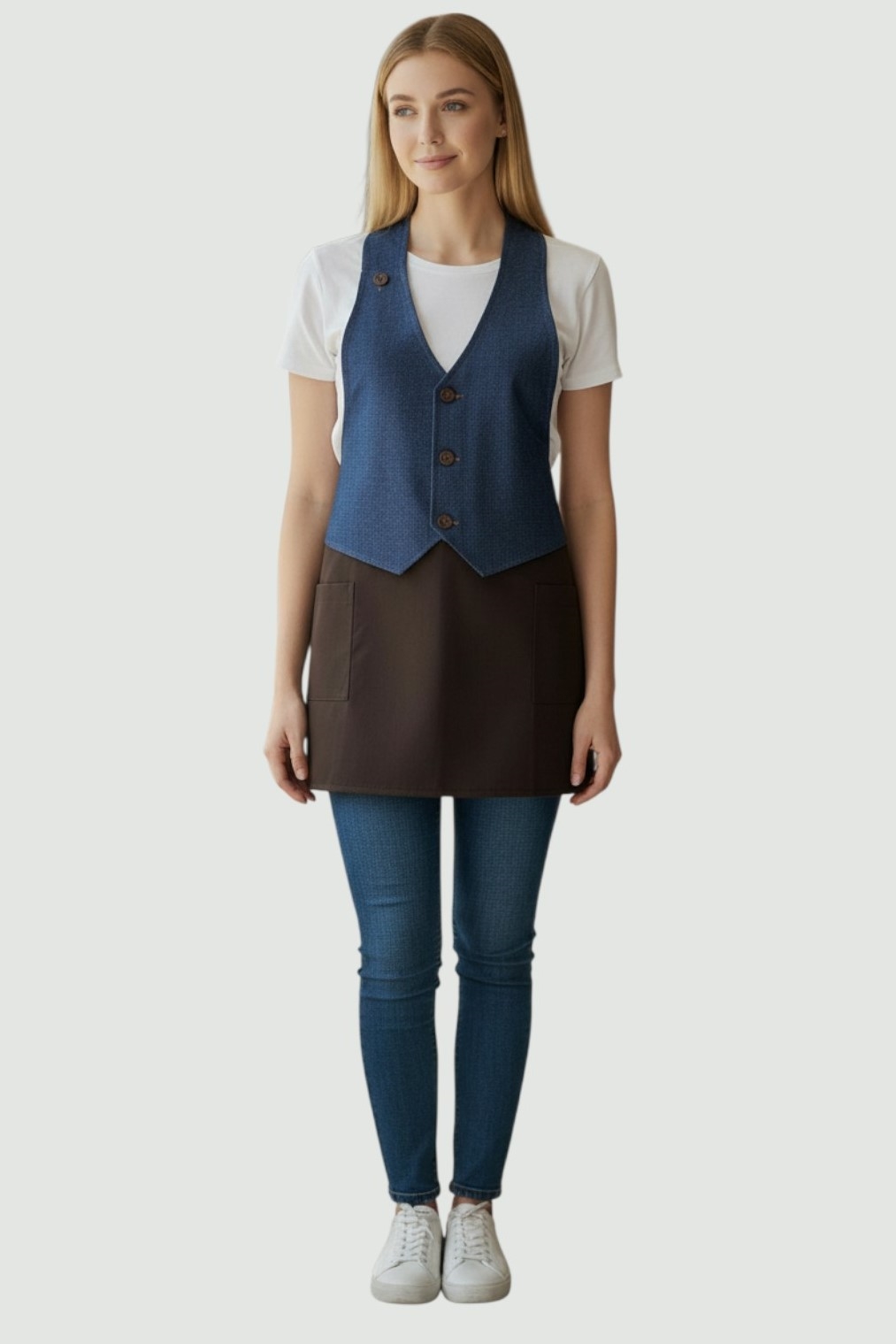 Ποδιά γιλέκο γυναικεία, από ύφασμα τζίν και καπαρντίνα 65/35 pol/cotton 240 γρ βάρος.