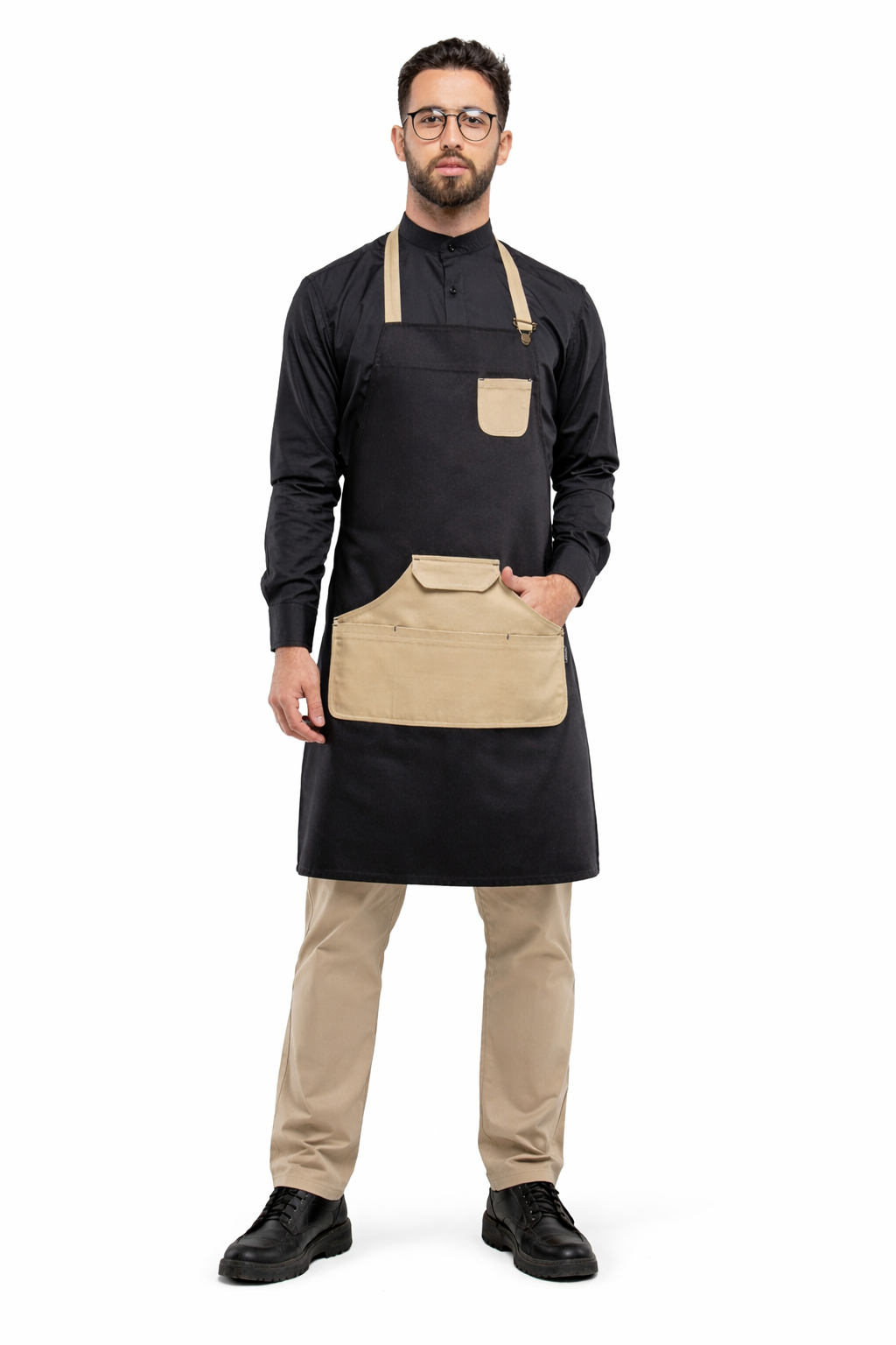 Ποδιά λαιμού από καμβά, με μεταλλικό ρυθμιστή στο λαιμό για εύκολη χρήση. Μία τσέπη μεγάλη καγκουρό, μία μικρή στο στήθος και τριπλή τσέπη εμπρός. Ελληνικό προϊόν.