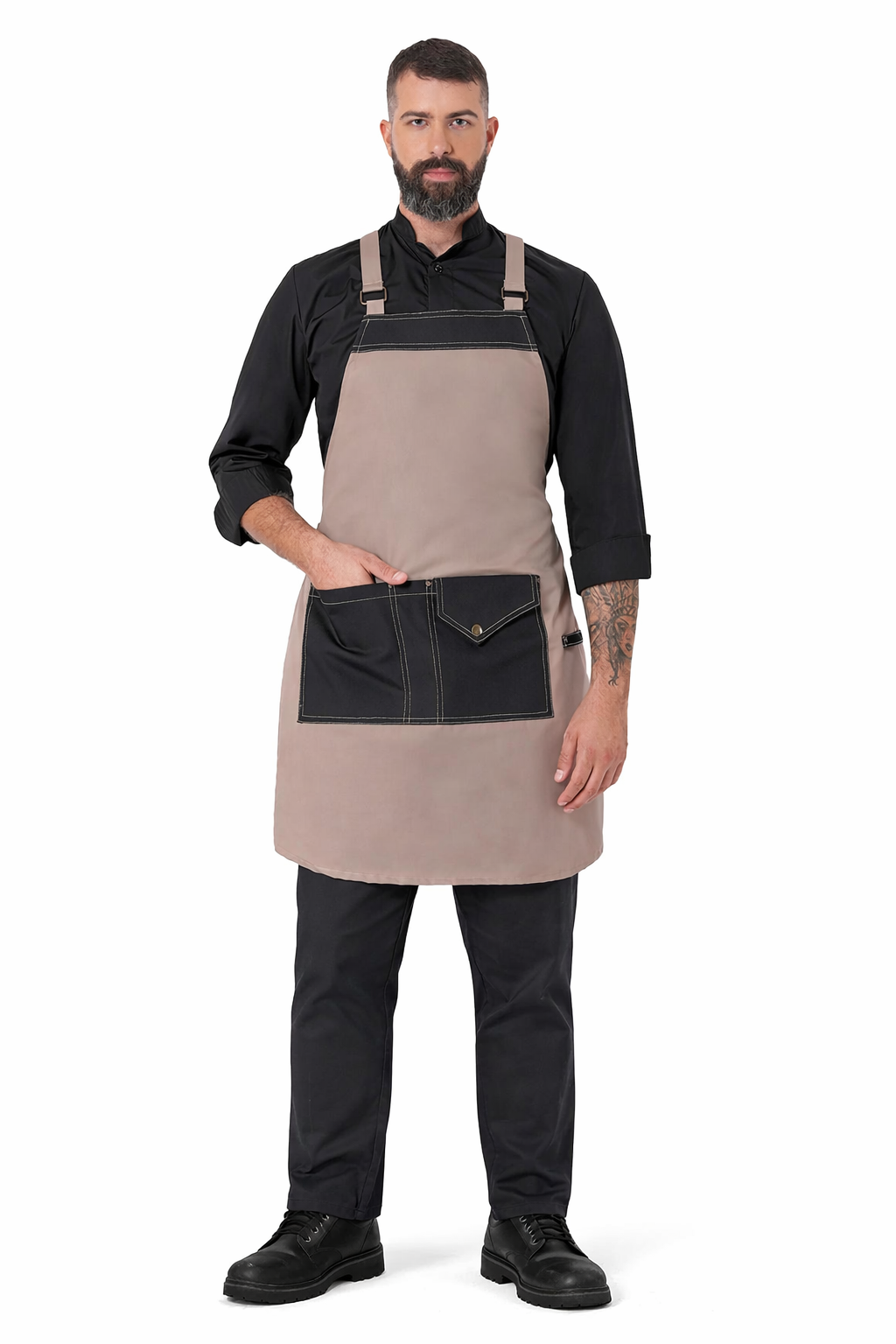 Ποδιά λαιμού με τιράντες και χιαστί κορδόνια στο πίσω μέρος με μεταλλικό κρίκο. Τριπλή τσέπη μπροστά όπου η μία κλείνει με καπάκι και τρούκ. Θηλύκι για τοποθέτηση πετσέτας. Διακοσμητικά πιρτσίνια. Οι τσέπες είναι κατασκευασμένες από καμβά 320gsm. Βάρος: 245gsm | Σύνθεση: 65% polyester - 35%cotton.
