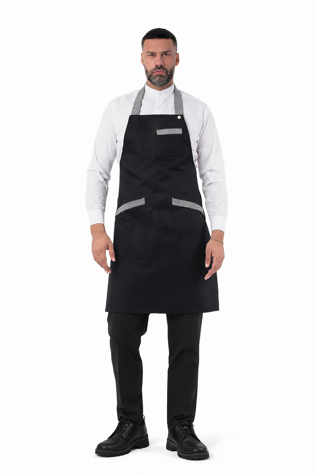 Ποδιά λαιμού μαύρη με λουρί στο λαιμό και δύο μεταλλικά τρούκ για εύκολη ρύθμιση. Τρεις τσέπες, μία καρό στο στήθος, δύο στους γοφούς δεξιά και αριστερά με λεπτομέρειες. Ελληνικό προϊόν. 245g/m2 | 65% polyester - 35% cotton. Διαστάσεις: ύψος 85εκ - φάρδος 67 εκ