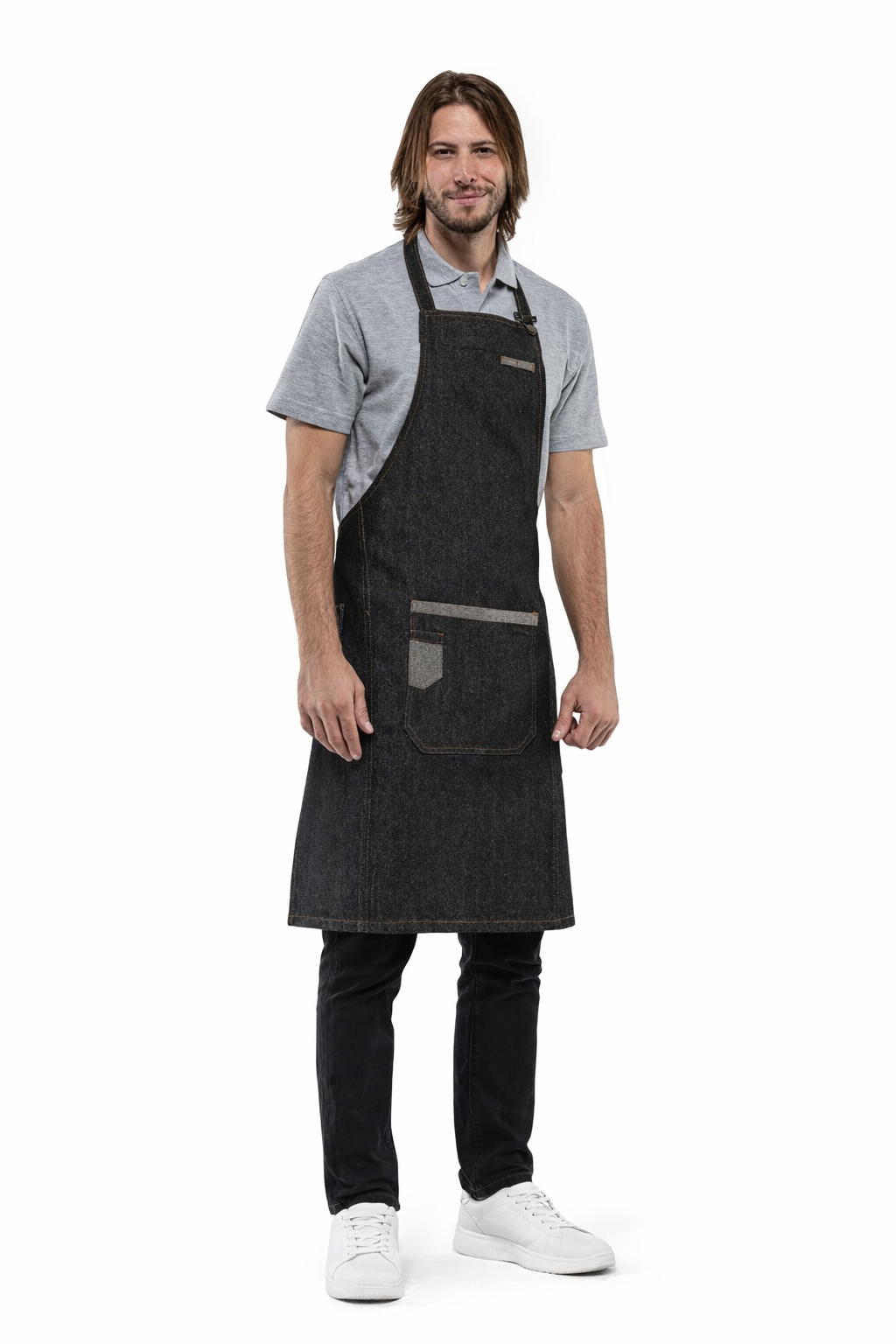 Ποδιά λαιμού Τζιν μαύρη με μεταλλικό μπρονζέ ρυθμιστή για εύκολη χρήση. Μία μεγάλη τσέπη στο κέντρο με επισυναπτόμενη διακοσμητική τσέπη. Μία τσέπη κάτω αριστερά για ανοιχτήρι. Μπρονζέ κρίκος για πετσέτα. Δύο θηλύκια στο στήθος.