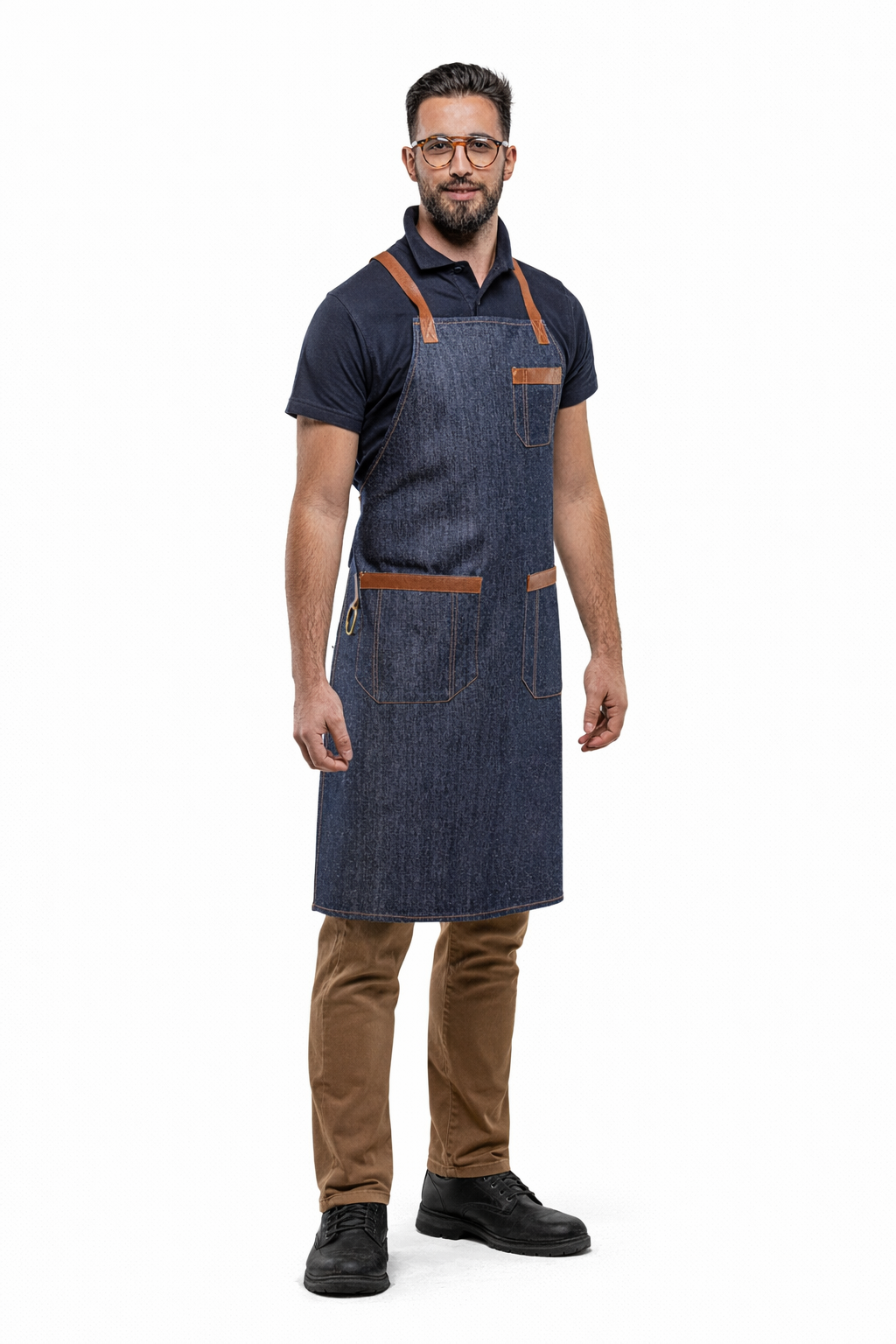 Ποδιά λαιμού Τζιν με χιαστί λουριά δερματίνης στο λαιμό και μεταλλικό κρίκο στο πίσω μέρος. Τρεις τσέπες με λεπτομέρειες δερματίνης, μία στο στήθος και άλλες δύο στη μέση δεξιά και αριστερά. Ελληνικό προϊόν.