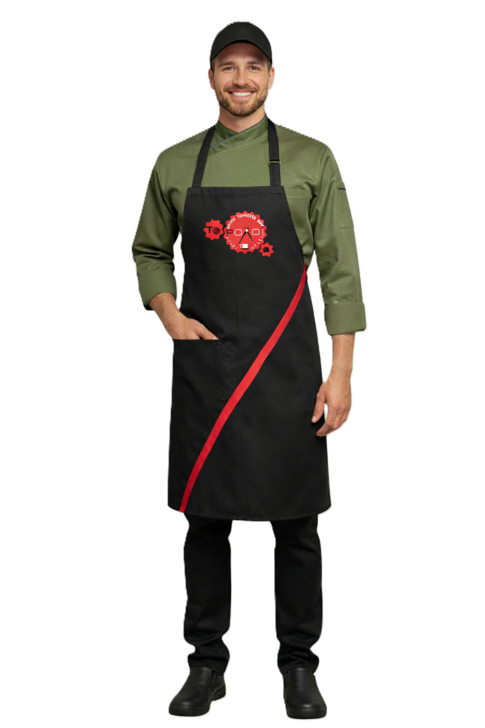 Ποδιά στήθους με μια τσέπη και διαγώνια διχρωμία. Υπάρχει δυνατότητα κατασκευής σε όλους τους συνδυασμούς χρωμάτων.