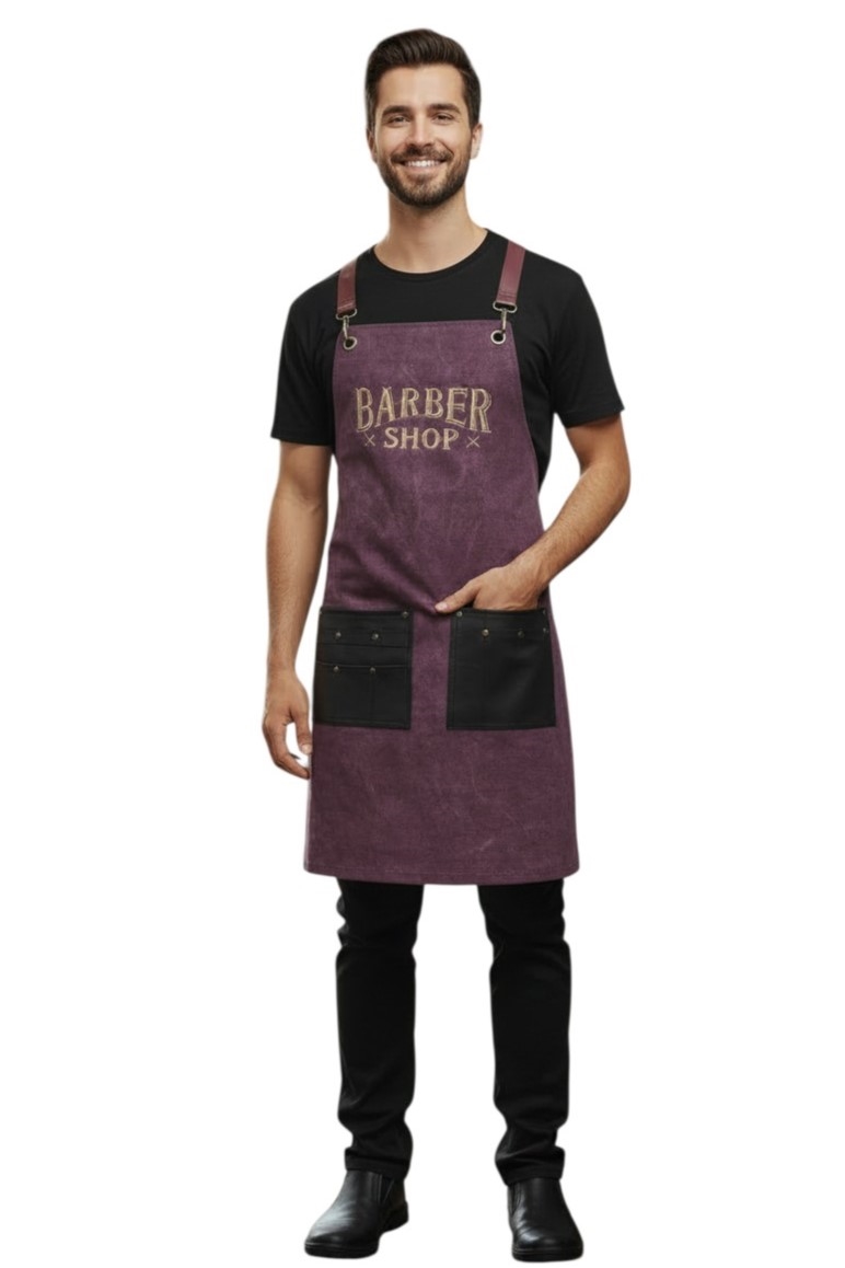 Επαγγελματική ποδιά barber, κατασκευασμένη από ανθεκτικό ύφασμα με vintage όψη. Διαθέτει ρυθμιζόμενους ιμάντες από δερματίνη με δέσιμο χιαστί στην πλάτη για άνετη εφαρμογή και σταθερότητα κατά τη διάρκεια της εργασίας. Στο μπροστινό μέρος φέρει πρακτικές τσέπες για εργαλεία, ενώ το σχέδιο/κέντημα barber προσδίδει επαγγελματικό και ξεχωριστό στυλ. Κατάλληλη για κουρεία και επαγγελματική χρήση.