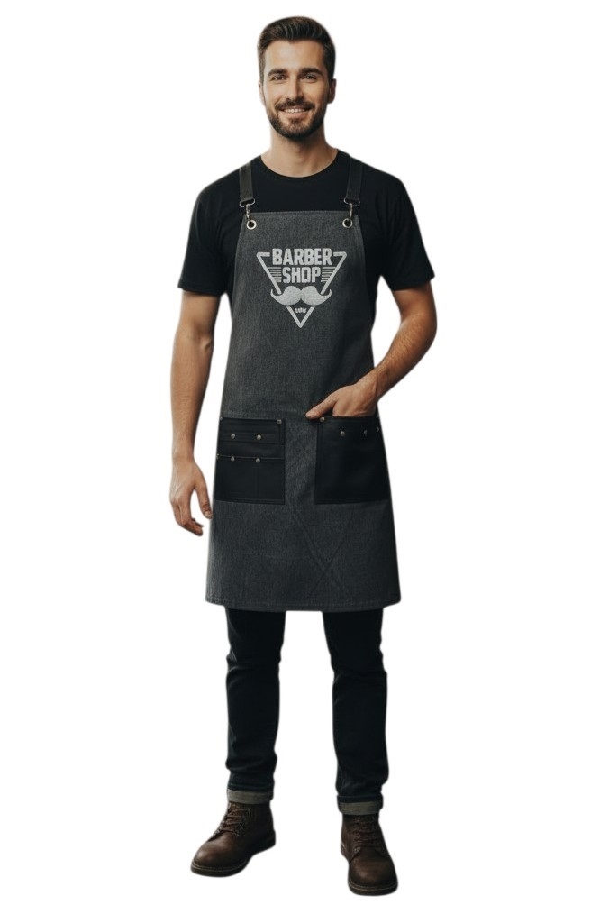 Επαγγελματική ποδιά barber, κατασκευασμένη από ανθεκτικό ύφασμα με vintage όψη. Διαθέτει ρυθμιζόμενους ιμάντες από δερματίνη με δέσιμο χιαστί στην πλάτη για άνετη εφαρμογή και σταθερότητα κατά τη διάρκεια της εργασίας. Στο μπροστινό μέρος φέρει πρακτικές τσέπες για εργαλεία, ενώ το σχέδιο/κέντημα barber προσδίδει επαγγελματικό και ξεχωριστό στυλ. Κατάλληλη για κουρεία και επαγγελματική χρήση.
