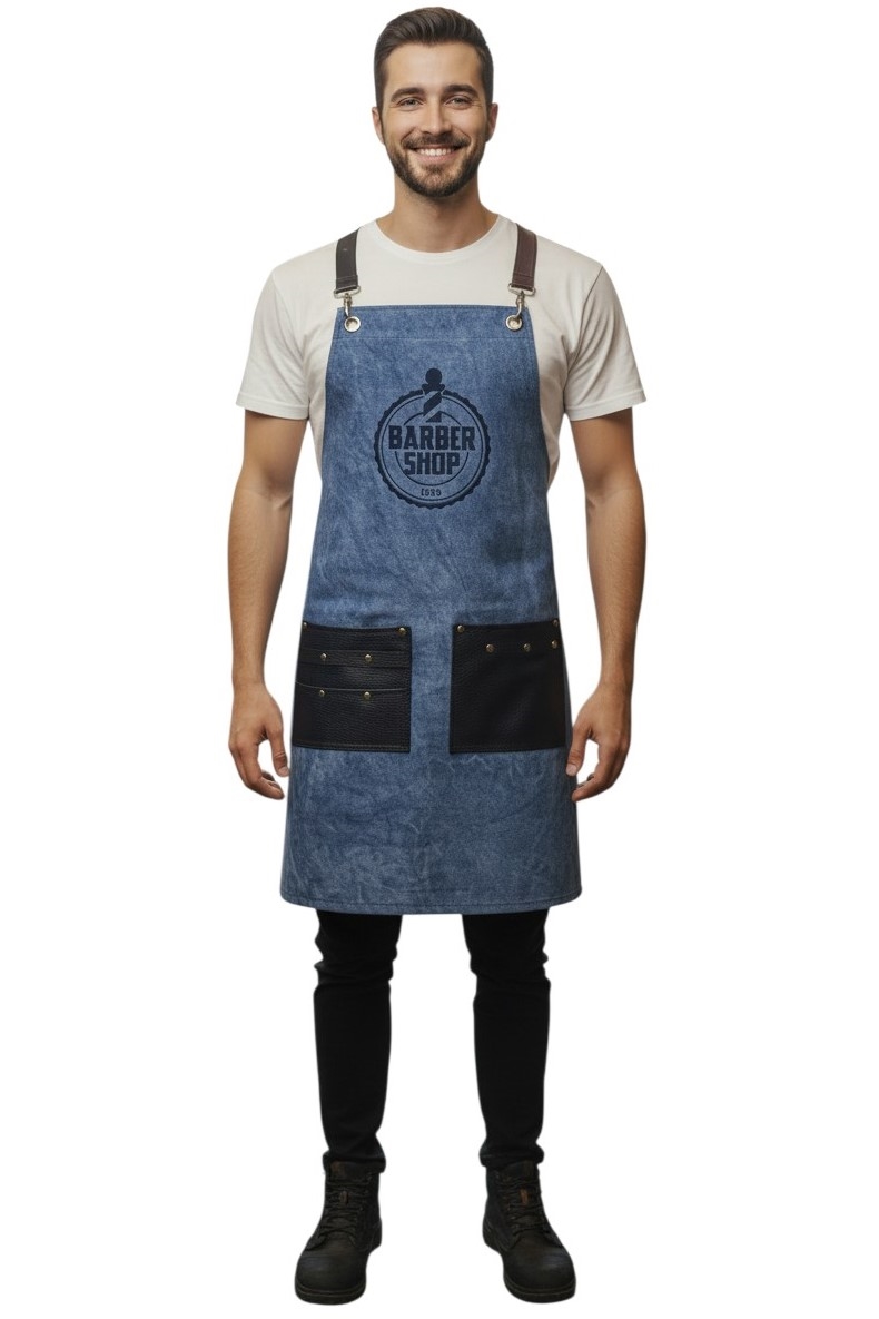 Επαγγελματική ποδιά barber, κατασκευασμένη από ανθεκτικό ύφασμα με vintage όψη. Διαθέτει ρυθμιζόμενους ιμάντες από δερματίνη με δέσιμο χιαστί στην πλάτη για άνετη εφαρμογή και σταθερότητα κατά τη διάρκεια της εργασίας. Στο μπροστινό μέρος φέρει πρακτικές τσέπες για εργαλεία, ενώ το σχέδιο/κέντημα barber προσδίδει επαγγελματικό και ξεχωριστό στυλ. Κατάλληλη για κουρεία και επαγγελματική χρήση.