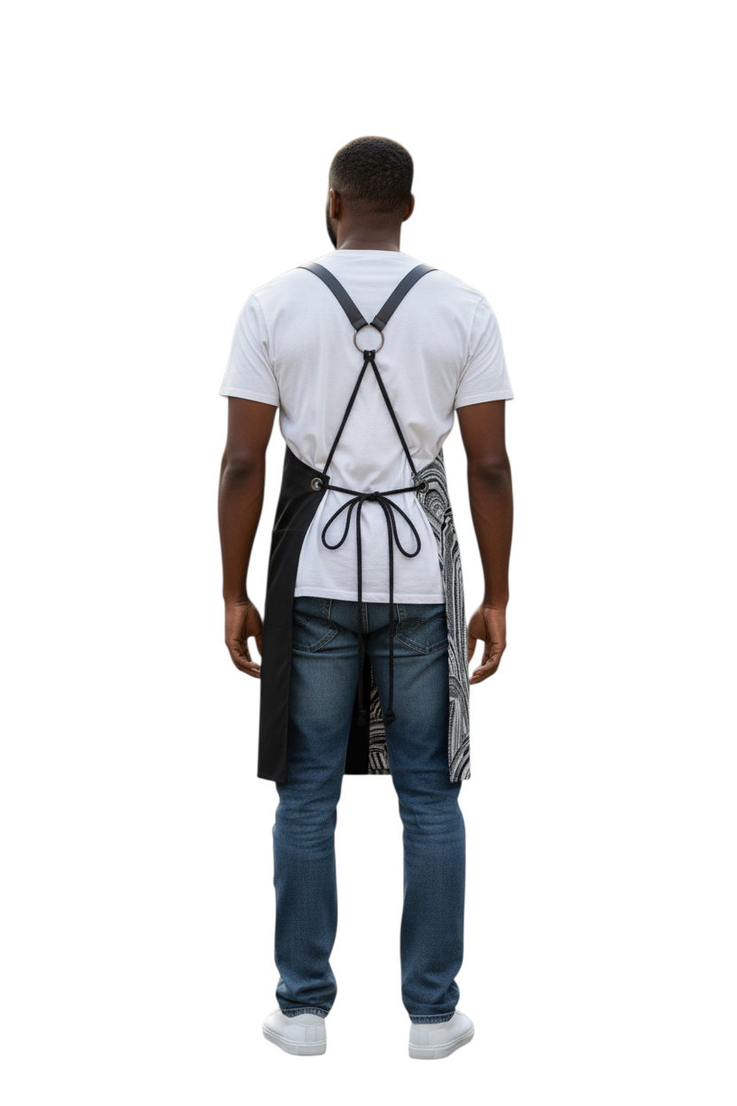 Χειροποίητη ποδιά στήθους από ύφασμα PRINT σε συνδιασμό με ύφασμα καπαρτνίνα. Με χιαστή λουράκια δεσίματος από δέρμα τα οποία στο τελείωμα δένουν με κορδόνι που προσφέρουν ευκολία στην εφαρμογή της ποδιάς για κάθε σώμα ξεχωριστά. Μόστρα με μπρούτζινα τρουκ και δίπλωμα πέτου. Τσέπες στη μία πλευρά άνω και κάτω .