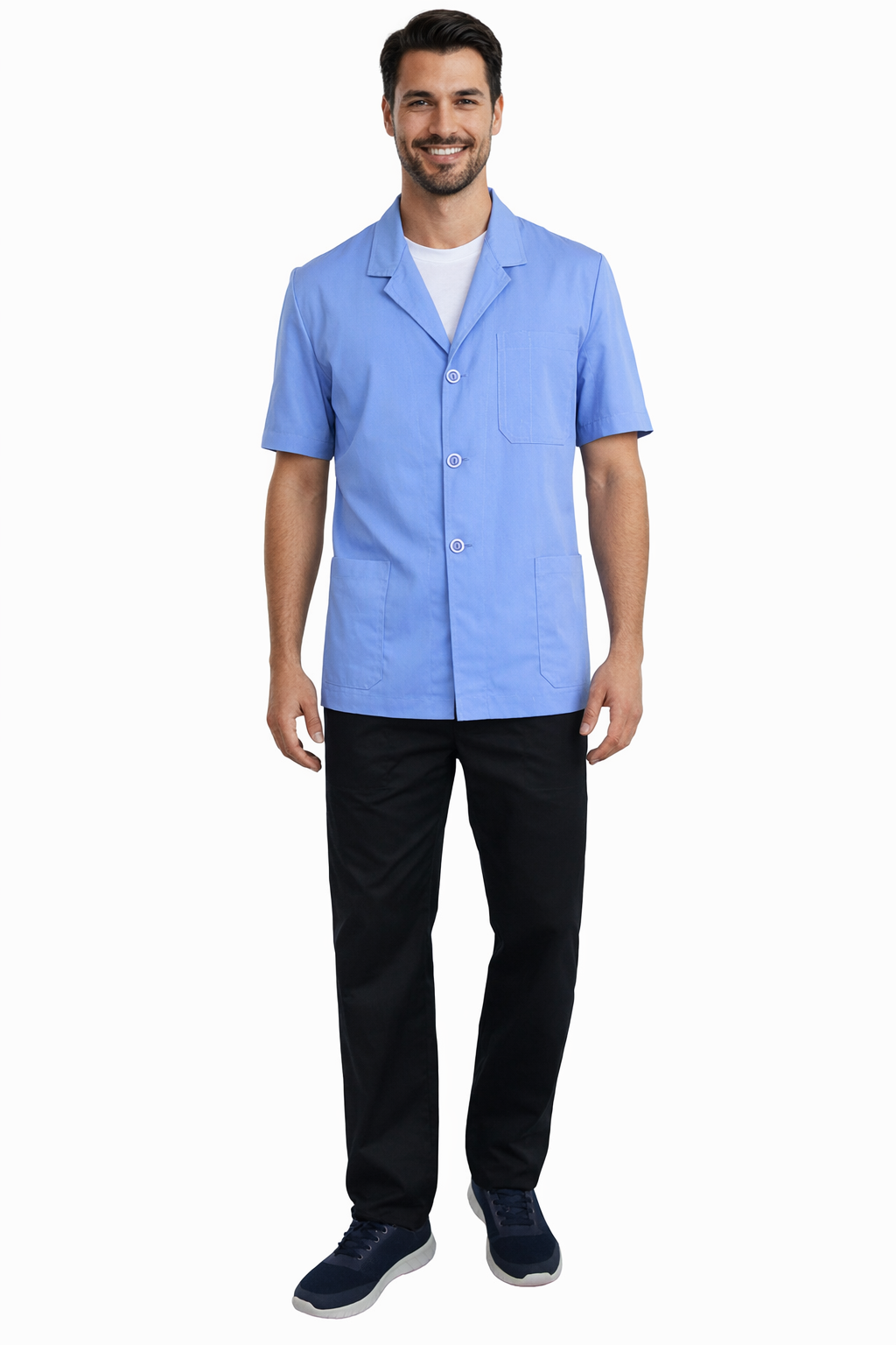 Σακάκι ανδρικό σε χρώμα σιέλ με κοντό μανίκι , πέτο γιακά , από ύφασμα ποπλίνα 150 gr βάρος 65/35 pol/cotton.