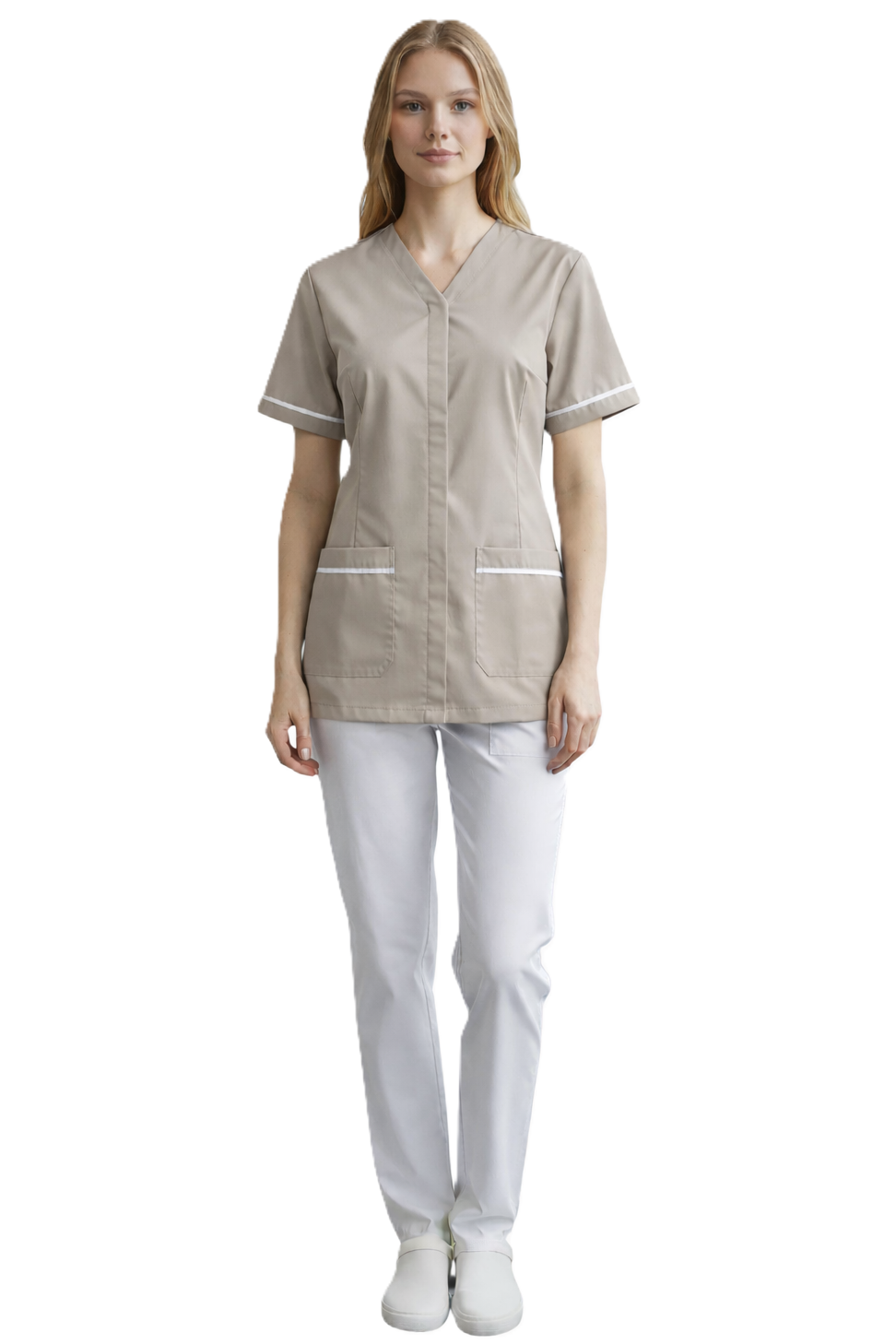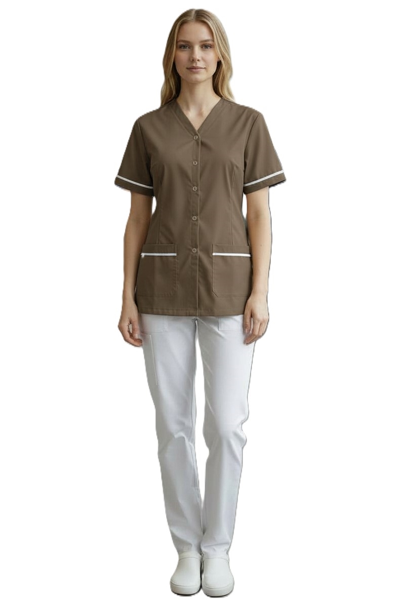 Γυναικείο σακάκι χωρίς γιακά , κοντομάνικο και διχρωμία με λευκό ρέλι . Κλείνει μπροστά με κρυφό κούμπωμα (μπορεί να γίνει και χωρίς πατιλέτα) και έχει δύο μεγάλες τσέπες στο κάτω μέρος.