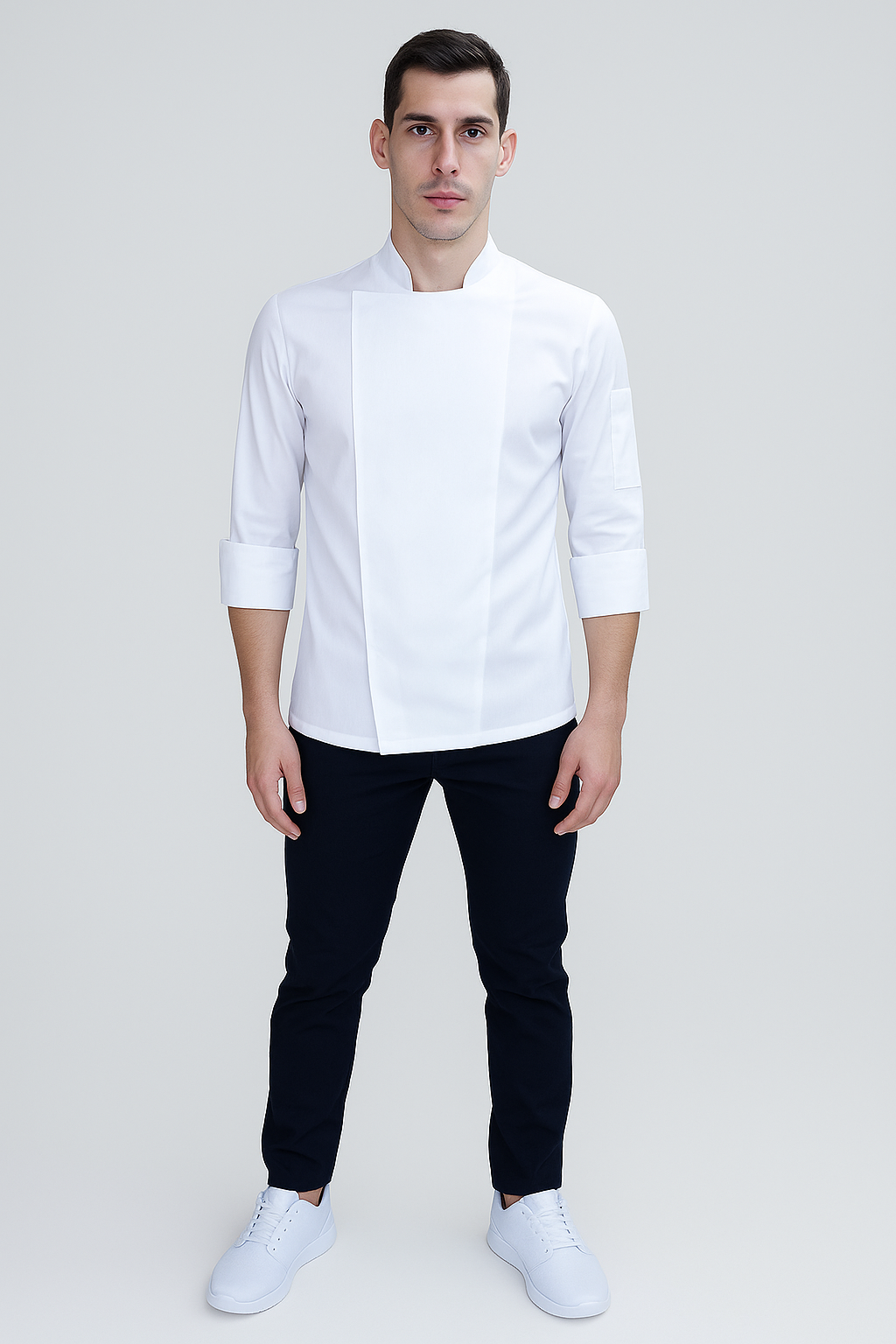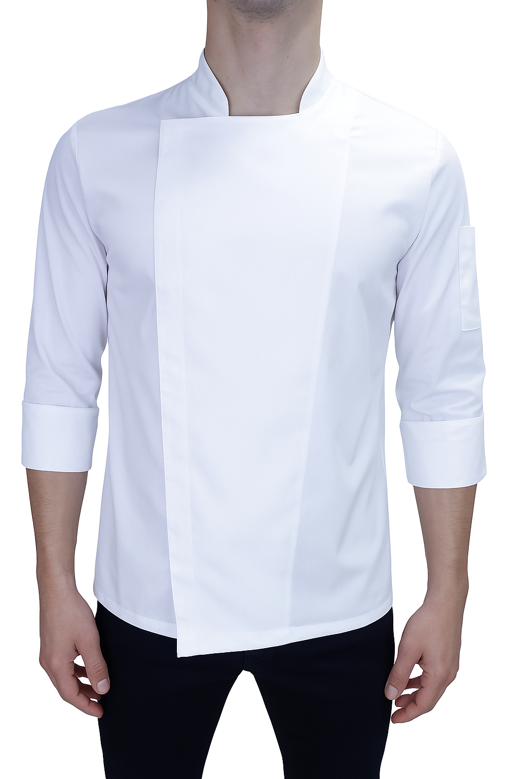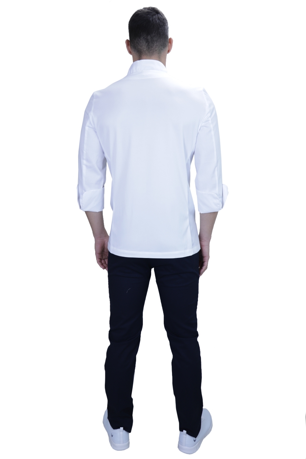 Σακάκι μαγείρου από ύφασμα καπαρντίνα ελαφριά 165 γρ βάρος, σε γραμμή slim fit, με τρουακάρ μανίκι, με κρυφή κόπιτσα και ελαστικό αναπνέον ύφασμα στην πλάτη.
