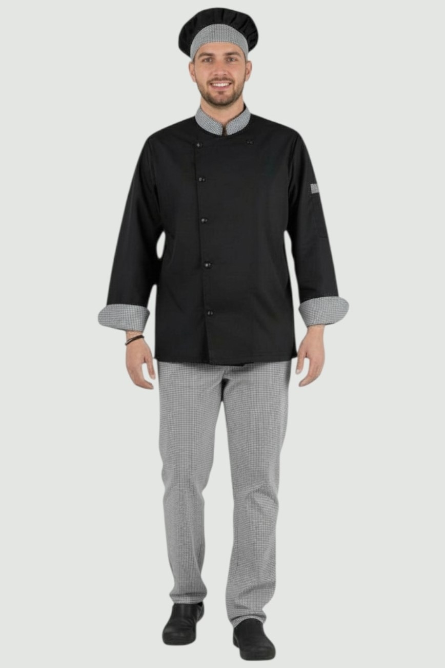 Σακάκι μάγειρα με καρό λεπτομέρειές στο λαιμό και στη μανσέτα. Κλείνει μπροστά με τρούκ. Μία τσέπη στο αριστερό μανίκι. Γιακάς τύπου ΜΑΟ. Αναδιπλούμενα μανίκια. Σύνθεση: 165g/m² | 65% polyester - 35% cotton.
