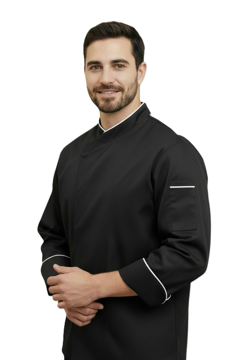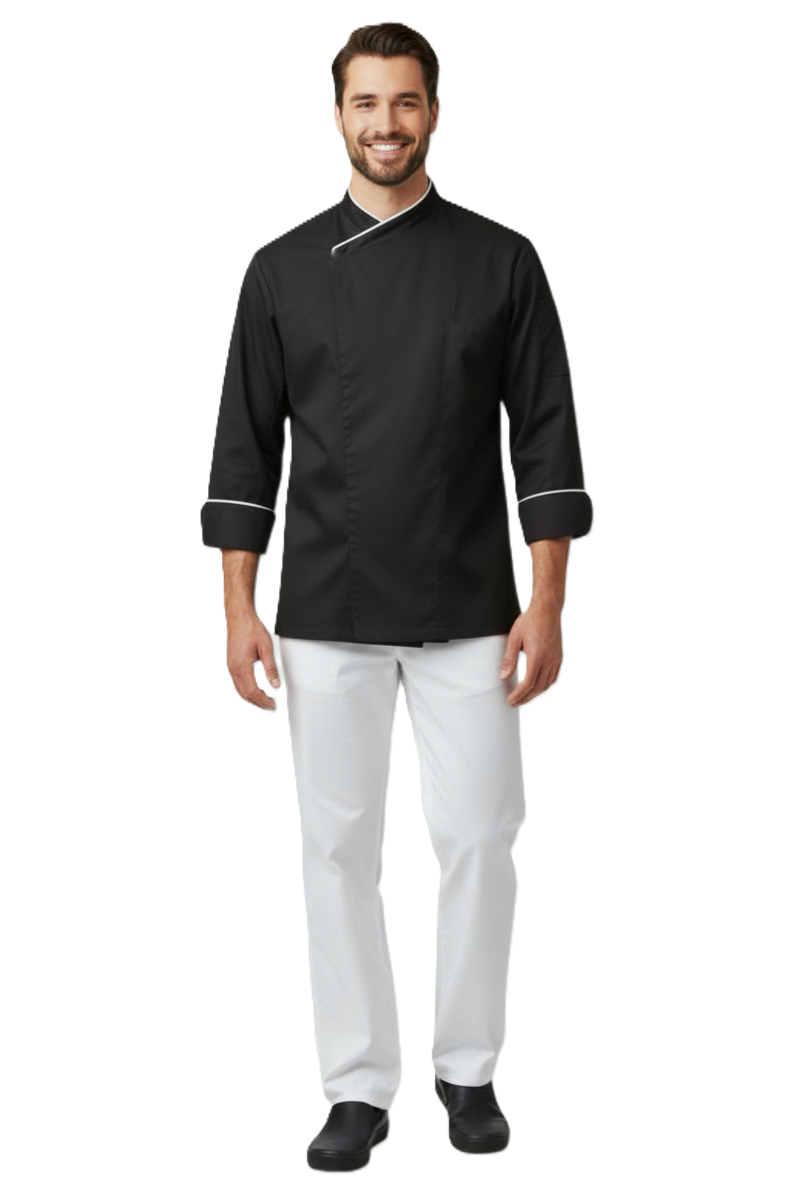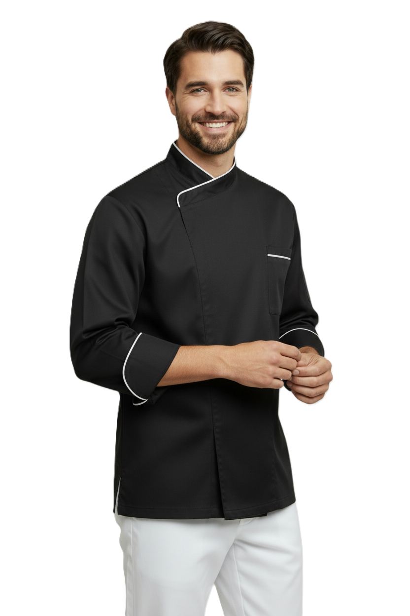 Σακάκι μαγείρου με διχρωμία , ύφασμα ελαστική καπαρντίνα 200 γρ. 62%pol/35%cot/3%el με κρυφά κουμπιά κόπιτσα πλάτη ελαστική αεριζόμενη και μανίκι τριών τετάρτων.