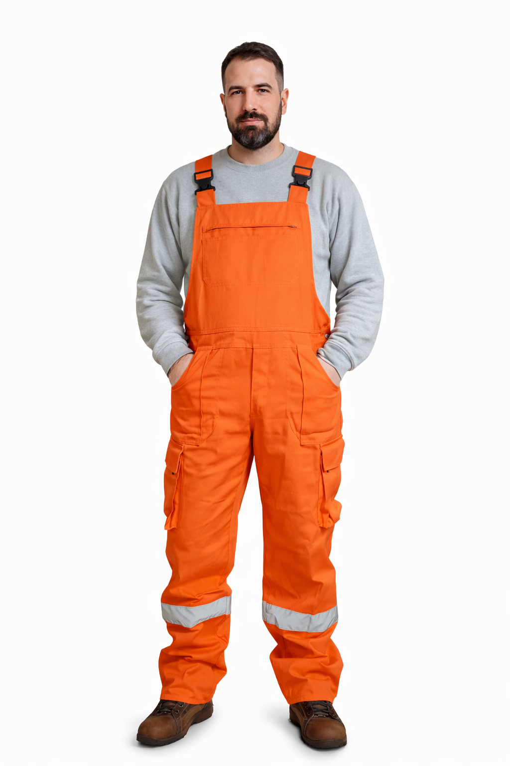 Φόρμα εργασίας τιράντα ERGOLINE από 65% polyester - 35% βαμβάκι, σε χρώμα φωσφορίζον πορτοκαλί με ανακλαστικές ταινίες στα μπατζάκια.
